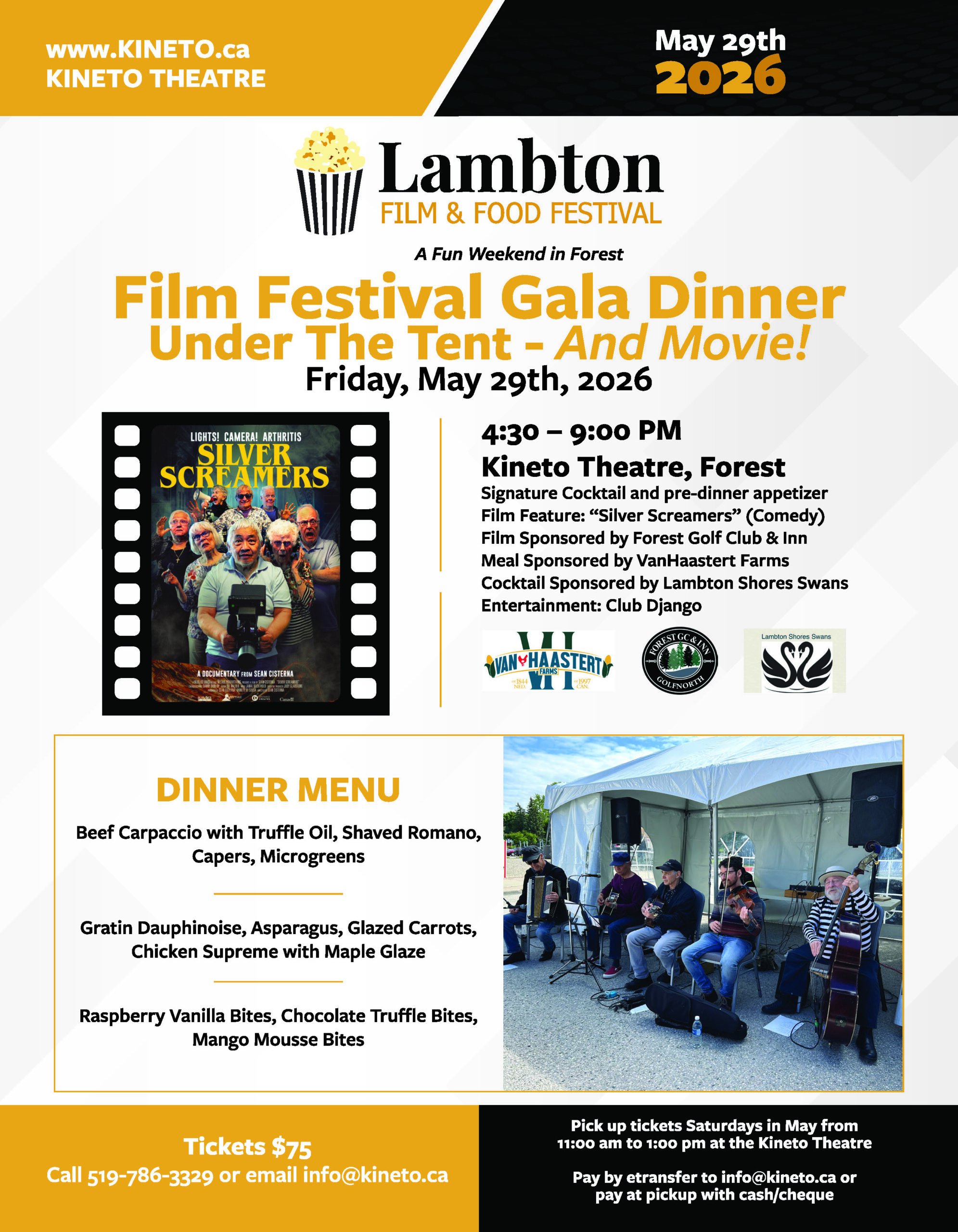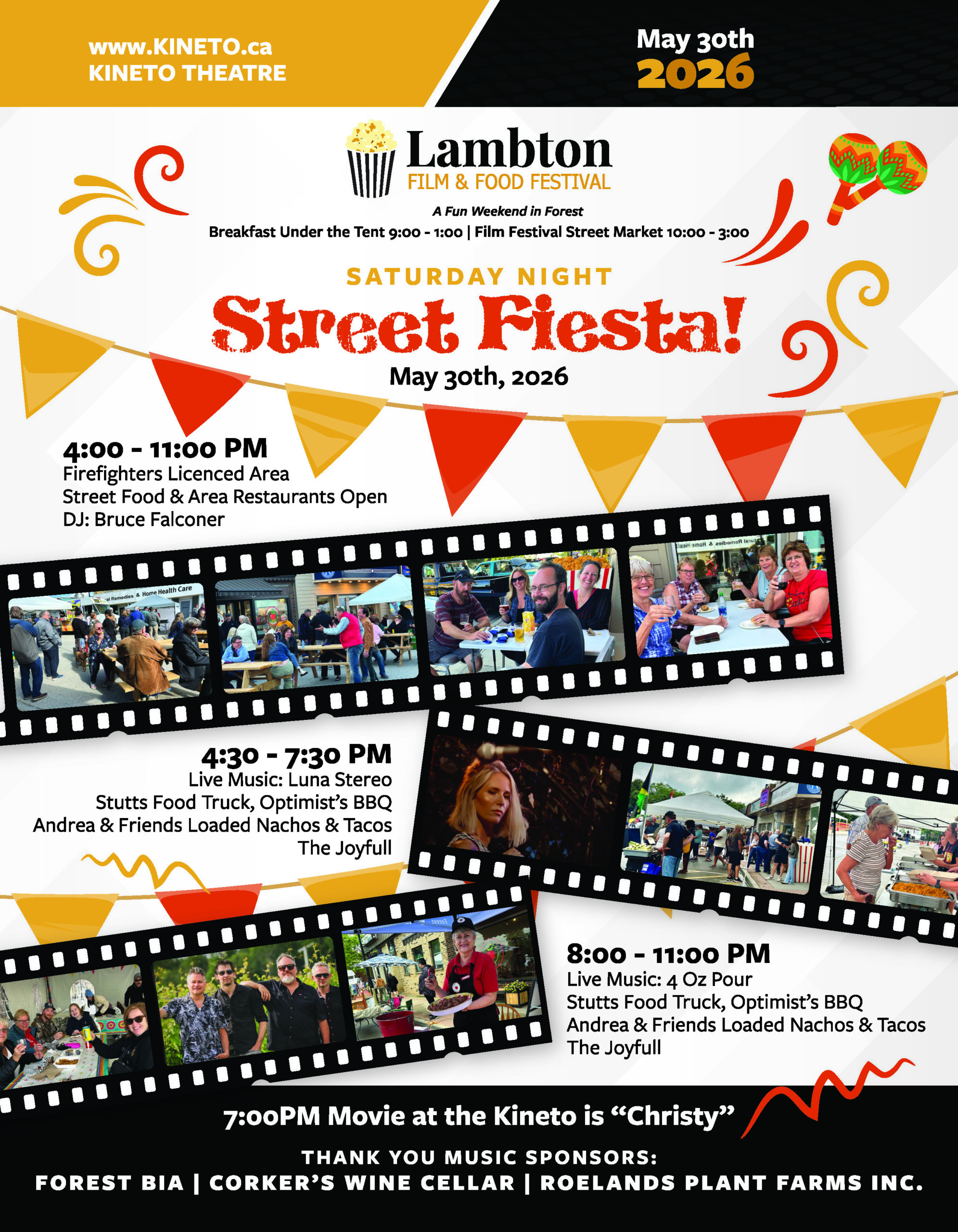 4:00 pm – 11:00 pm – Dinner on the street from Stutts Food Truck, Forest Optimists BBQ, The Joyfull, Andrea & Friends Mexica Delights